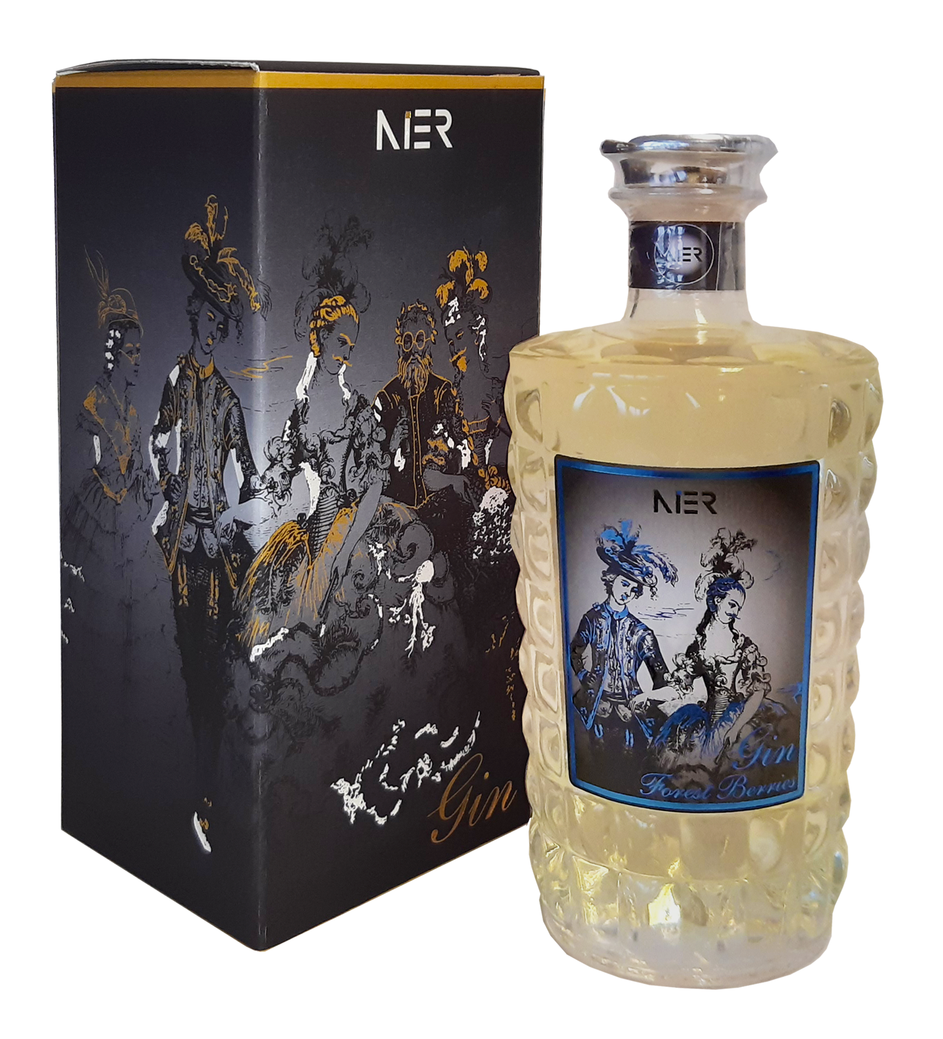 Náš osviežujúci gin je z robustnej zmesi s trochou cukru, aby sa ešte viac zvýraznili arómy lesných plodov. Prezentuje sa svetlou modro-bielou farbou, ktorá oživí váš koktail. 46 % alkoholu/obj. v našej vybranej krištáľovej fľaši. Gin vyrábame v Trentini. Základom je neutrálny biely destilát z hrozna + borievky + maliny a čučoriedky = Nier Gin, pričom farba pochádza z destilácie bobúľ. K dispozícii iba v sete s pohármi.