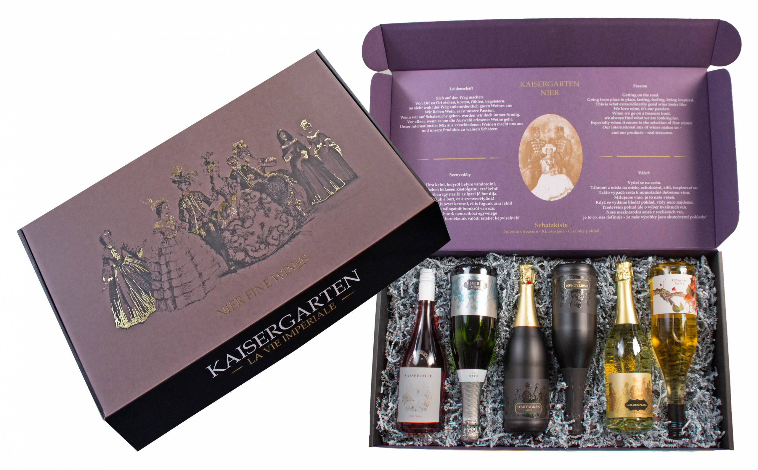 Žiarivá mozaika šumivých vín zhromaždená v sofistikovanej darčekovej krabičke Kaisergarten. Šesť vybraných skvostov umenia šumivého vína vás pozýva na objavenie: trblietavé šumivé víno Golden Pearl s 22-karátovým zlatým plátkom, elegantné UHU Pearl Secco, charakteristické suché šumivé víno Kaiserperle Rizling, ovocné sladké Scheurebe D’Artagnan, zvodné broskyňové perlové secco La Vie a jemne šumivé Cava Mundo de Sueños brut. Súbor plný brilantnosti, elegancie a pôžitku – perfektný darček pre skutočných milovníkov secca.